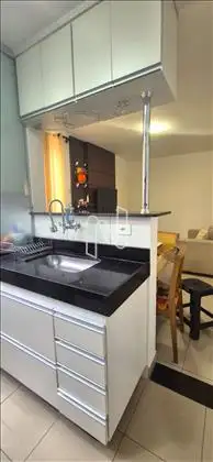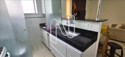 O imóvel conta com sala com painel e piso em porcelanato, cozinha com armários planejados, área de serviço com fechamento em blindex, e banho social totalmente revestido com box em blindex. São 2 quartos, sendo um com armário planejado e piso laminado, garantindo charme e funcionalidade.