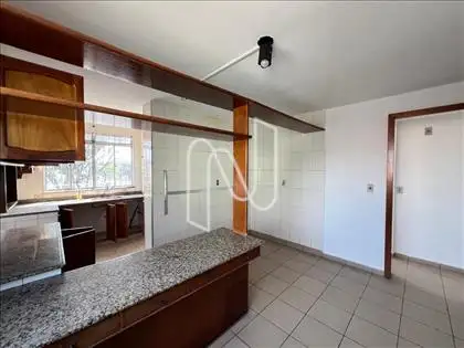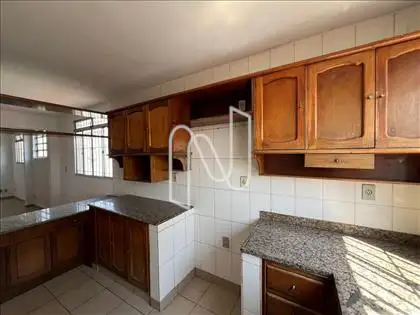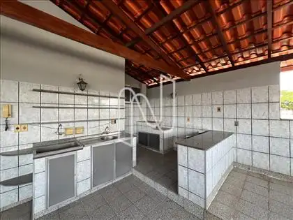 - cozinha ampla e arejada revestida em cerâmica com balcão em granito prateleira inteiriça em madeira pia em granito com fechamento de pia e armário suspenso