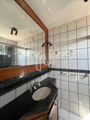 suíte, revestido em cerâmica com pia e granito fechamento de pia armário em madeira rústica grande espelho moldurado em madeira Box Blindex